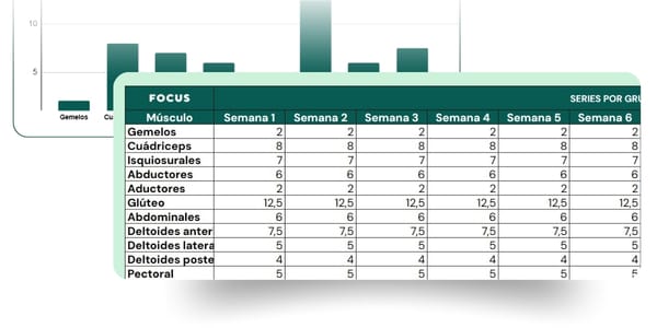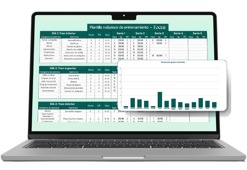 Ingresa los ejercicios y la plantilla te muestra automáticamente cuánto volumen estás haciendo por grupo muscular.