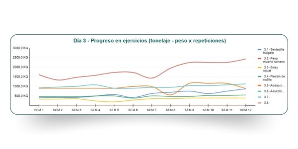 Puedes ver gráficamente la sobrecarga que estás teniendo por cada ejercicio